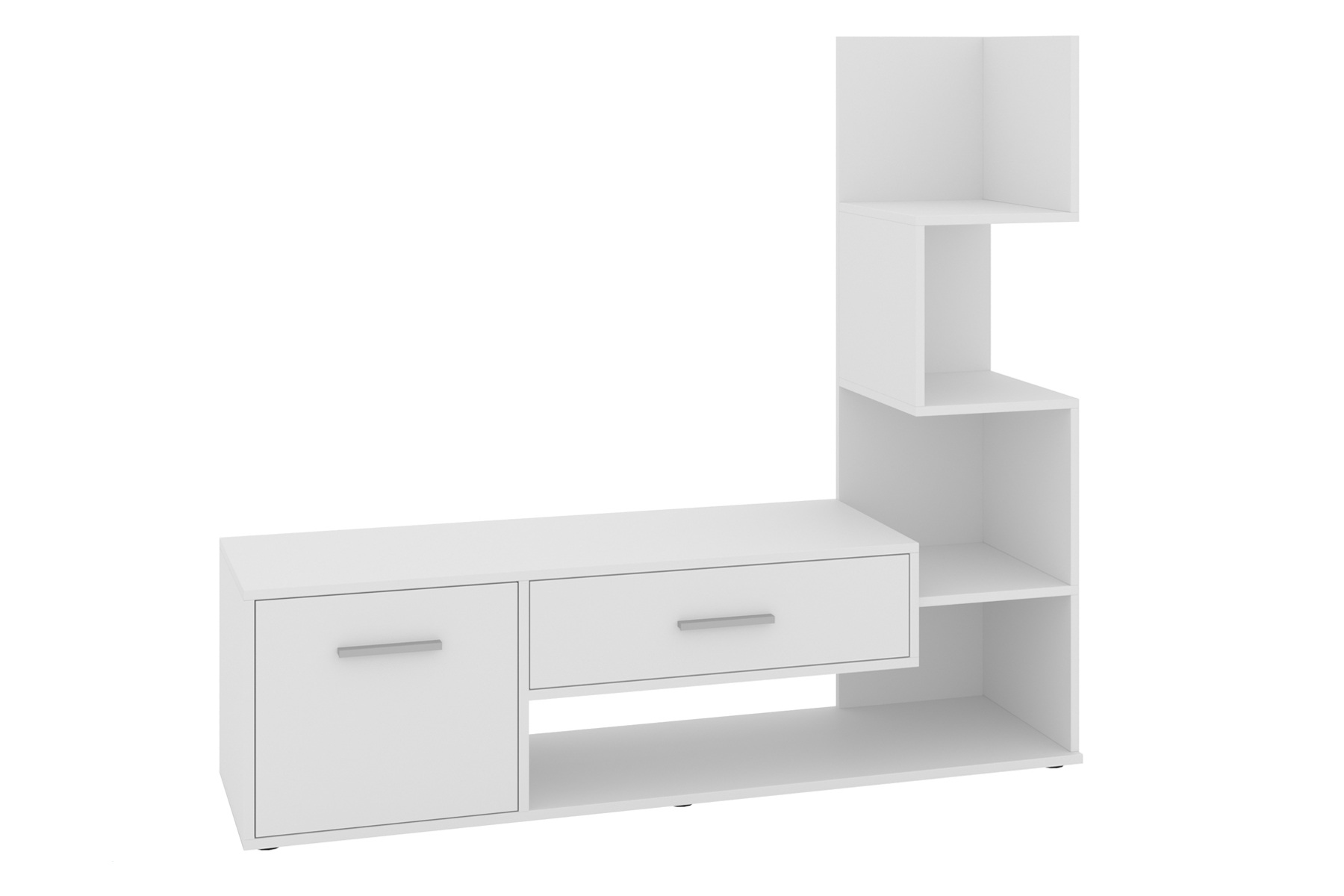 Ця тумба для телевізора має унікальний дизайн, яким вона відрізняється від багатьох інших моделей. Даний виріб складається з: горизонтальної частини – де можна розташувати ТВ та вертикальної частини з асиметричними відкритими полицями. В горизонтальній частині є одне закрите відділення з дверцятами та один висувний ящик, що забезпечує додатковий простір для зберігання.