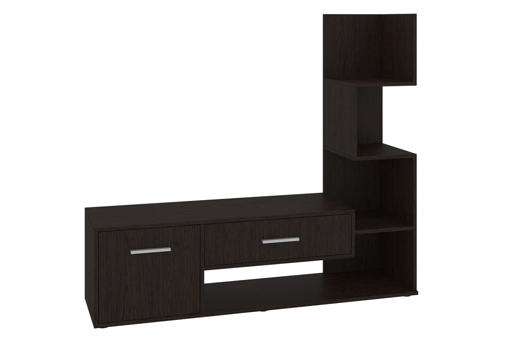 Ця тумба для телевізора має унікальний дизайн, яким вона відрізняється від багатьох інших моделей. Даний виріб складається з: горизонтальної частини – де можна розташувати ТВ та вертикальної частини з асиметричними відкритими полицями. В горизонтальній частині є одне закрите відділення з дверцятами та один висувний ящик, що забезпечує додатковий простір для зберігання.