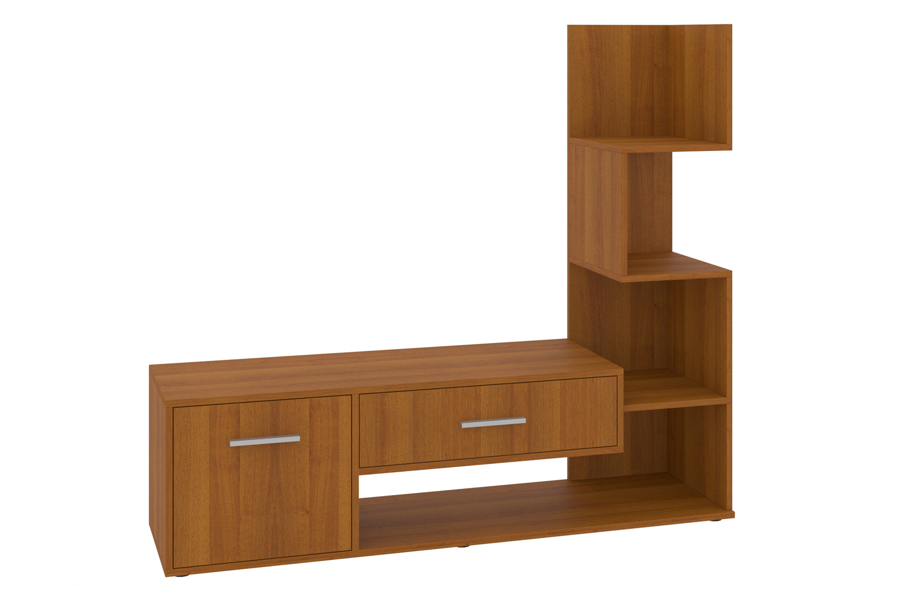 Ця тумба для телевізора має унікальний дизайн, яким вона відрізняється від багатьох інших моделей. Даний виріб складається з: горизонтальної частини – де можна розташувати ТВ та вертикальної частини з асиметричними відкритими полицями. В горизонтальній частині є одне закрите відділення з дверцятами та один висувний ящик, що забезпечує додатковий простір для зберігання.