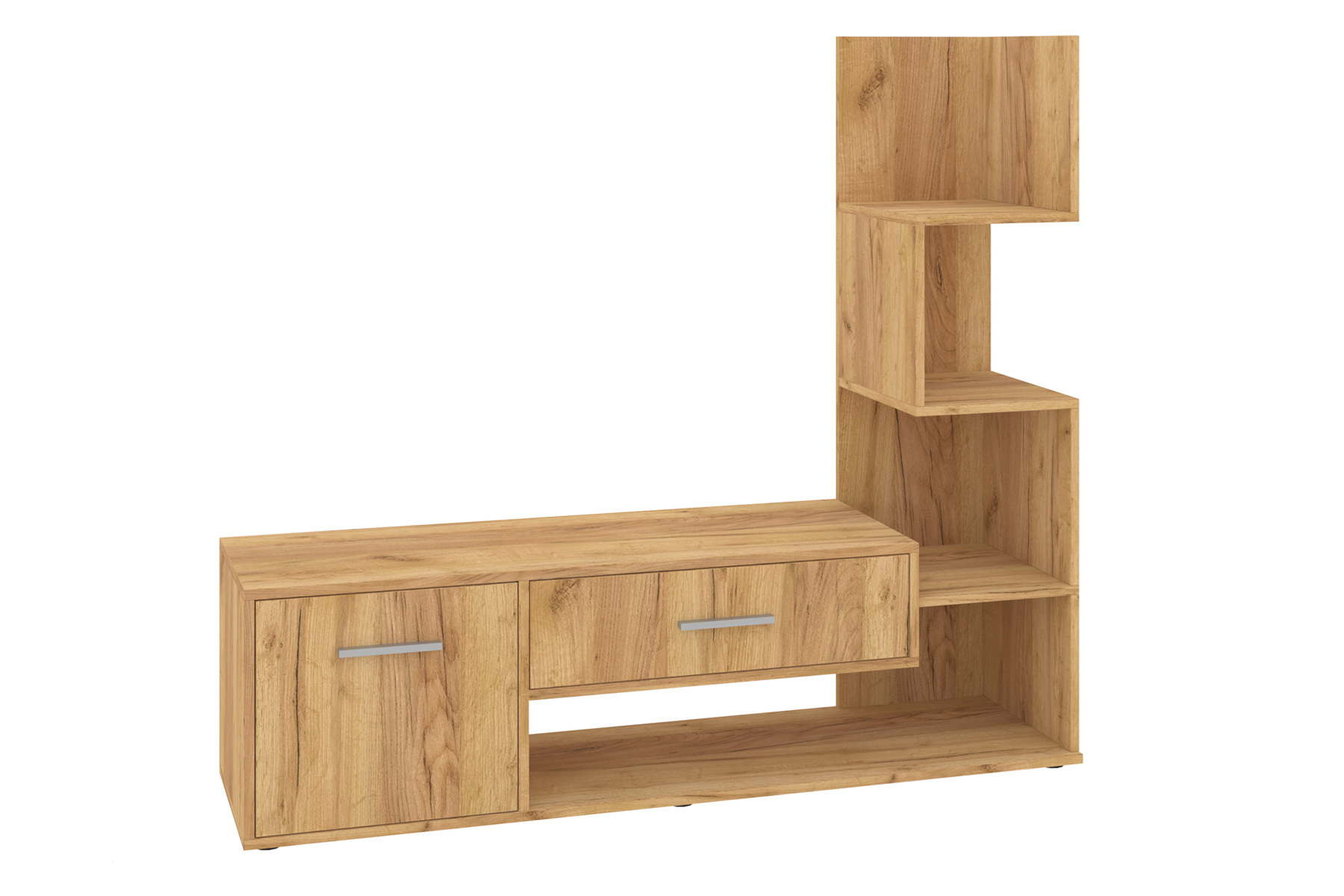 Ця тумба для телевізора має унікальний дизайн, яким вона відрізняється від багатьох інших моделей. Даний виріб складається з: горизонтальної частини – де можна розташувати ТВ та вертикальної частини з асиметричними відкритими полицями. В горизонтальній частині є одне закрите відділення з дверцятами та один висувний ящик, що забезпечує додатковий простір для зберігання.