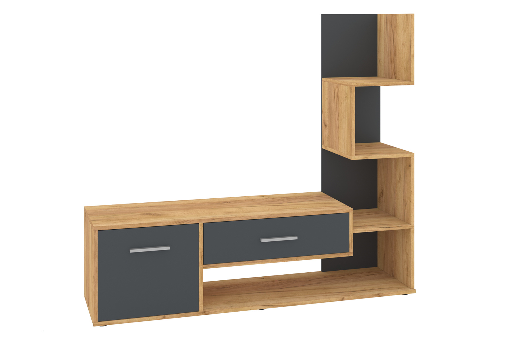 Ця тумба для телевізора має унікальний дизайн, яким вона відрізняється від багатьох інших моделей. Даний виріб складається з: горизонтальної частини – де можна розташувати ТВ та вертикальної частини з асиметричними відкритими полицями. В горизонтальній частині є одне закрите відділення з дверцятами та один висувний ящик, що забезпечує додатковий простір для зберігання.