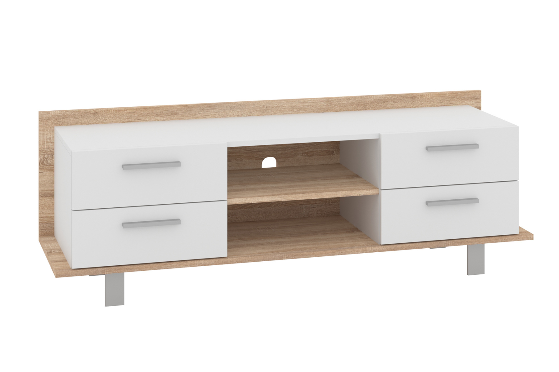 Дана модель найкраще прикрасить вашу спальню чи вітальню. Вона має міцну конструкцію і є простою та достатньо функціональною. Тумба складається з достатньо широкої верхньої поверхні – на ній можна розмістити ТВ. В центральній частині є дві відкриті полиці, а завдяки наявності отвору для кабелів на задній панелі, можна легко організувати дроти, щоб вони не заважали і знаходились в порядку.