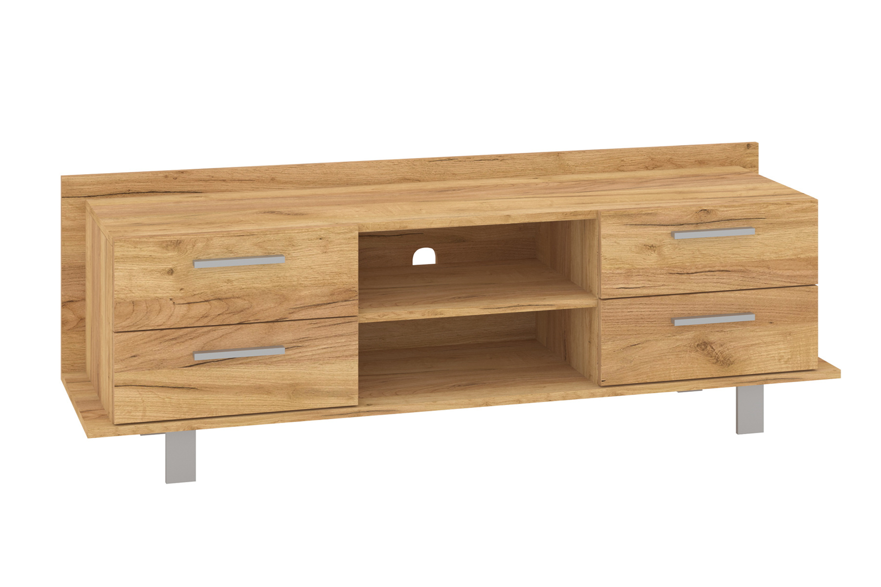 Дана модель найкраще прикрасить вашу спальню чи вітальню. Вона має міцну конструкцію і є простою та достатньо функціональною. Тумба складається з достатньо широкої верхньої поверхні – на ній можна розмістити ТВ. В центральній частині є дві відкриті полиці, а завдяки наявності отвору для кабелів на задній панелі, можна легко організувати дроти, щоб вони не заважали і знаходились в порядку.
