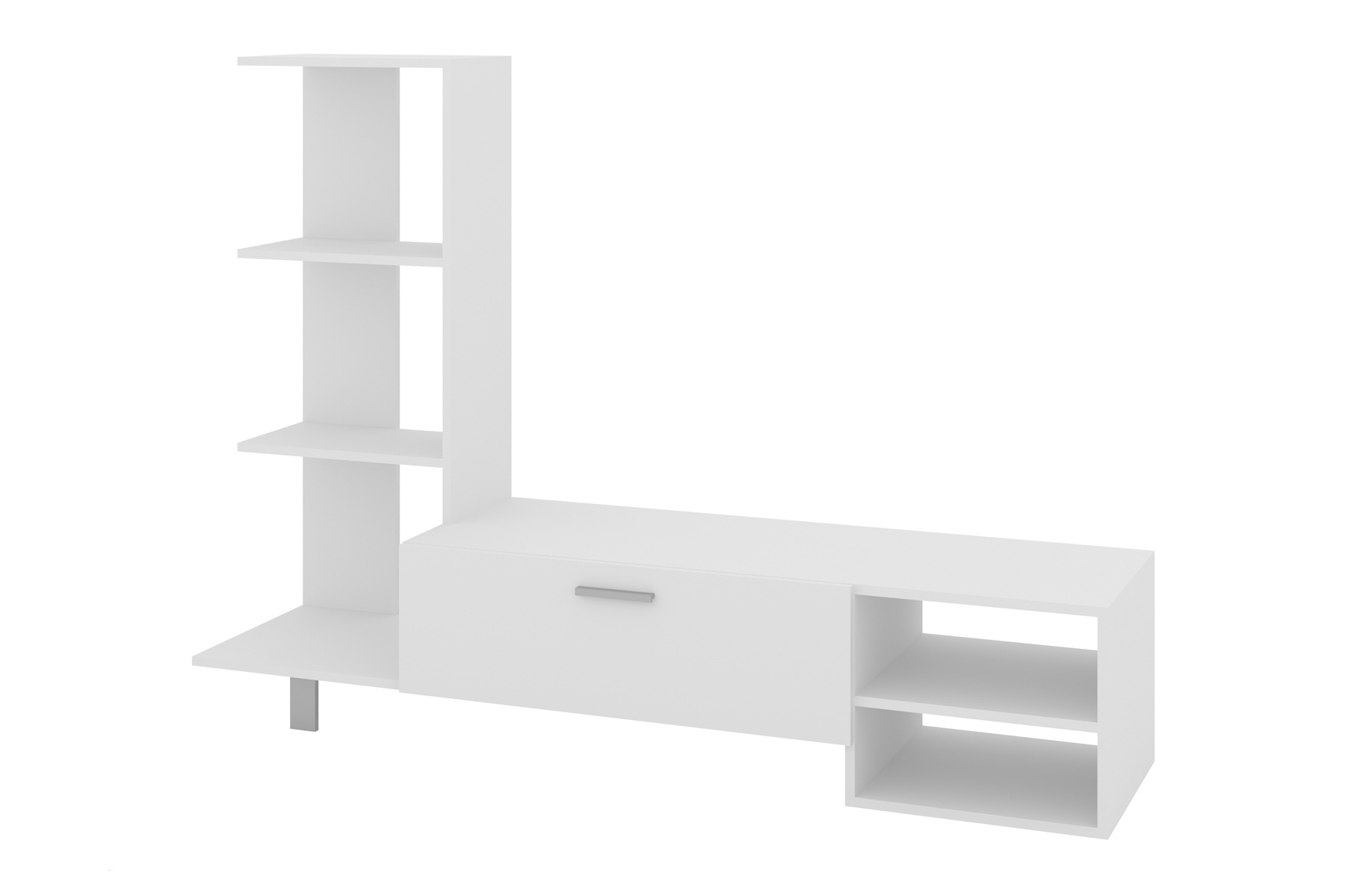 Горизонтальна частина тумби оснащена широкою поверхнею, що найкраще підходить для розміщення телевізора. Поруч з нею є відкритий відсік з двома полицями. Вони розраховані на зберігання мультимедійних пристроїв, таких як ресивери, ігрові консолі або книги. Також у цій частині розташований просторий ящик із зручною ручкою, який забезпечує додаткове місце для зберігання аксесуарів, пультів або кабелів.