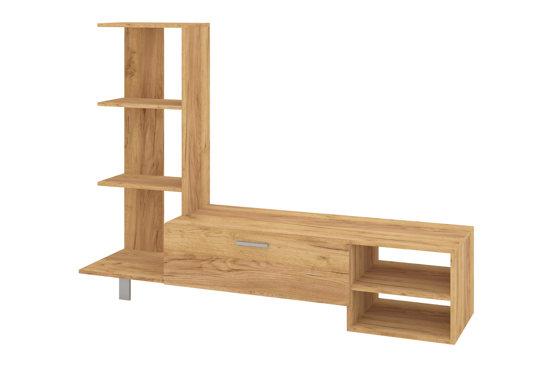 Горизонтальна частина тумби оснащена широкою поверхнею, що найкраще підходить для розміщення телевізора. Поруч з нею є відкритий відсік з двома полицями. Вони розраховані на зберігання мультимедійних пристроїв, таких як ресивери, ігрові консолі або книги. Також у цій частині розташований просторий ящик із зручною ручкою, який забезпечує додаткове місце для зберігання аксесуарів, пультів або кабелів.
