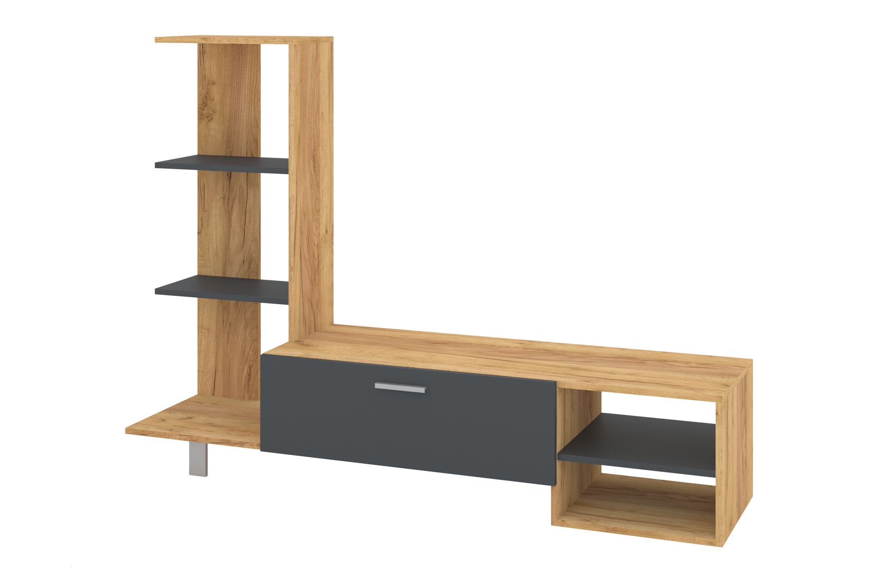 Горизонтальна частина тумби оснащена широкою поверхнею, що найкраще підходить для розміщення телевізора. Поруч з нею є відкритий відсік з двома полицями. Вони розраховані на зберігання мультимедійних пристроїв, таких як ресивери, ігрові консолі або книги. Також у цій частині розташований просторий ящик із зручною ручкою, який забезпечує додаткове місце для зберігання аксесуарів, пультів або кабелів.