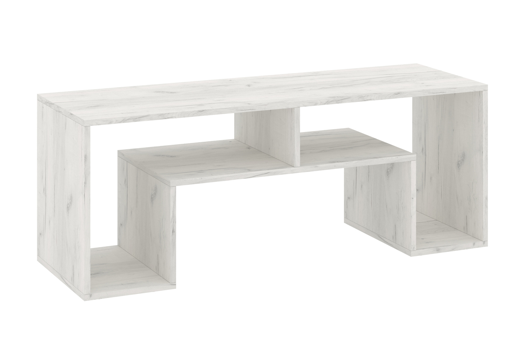 Основна частина тумби має три відкриті полиці різної висоти, що створює цікаву геометрію і дозволяє використовувати ці простори для розміщення телевізора, мультимедійних пристроїв, книг, журналів або декоративних предметів. Відкрита конструкція забезпечує легкий доступ до всіх речей і візуально розвантажує простір, роблячи кімнату світлішою і просторішою.