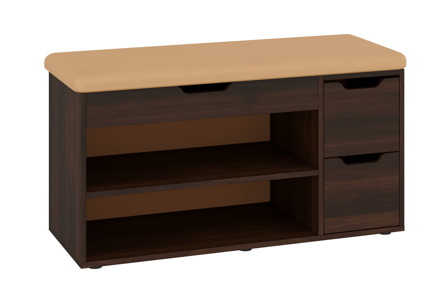 Модель складається з двох основних секцій. Ліворуч розташовані дві відкриті полиці, які також можуть бути використані, як додаткове місце для взуття або інших предметів. Праворуч знаходяться два висувні ящики, які забезпечують простір для зберігання дрібних речей. У ящиків є зручні виїмки замість ручок, що робить їх використання простим і зручним. Ще одна невелика шухлядка під сидінням дозволяє тримати під рукою креми та щітки для взуття.
