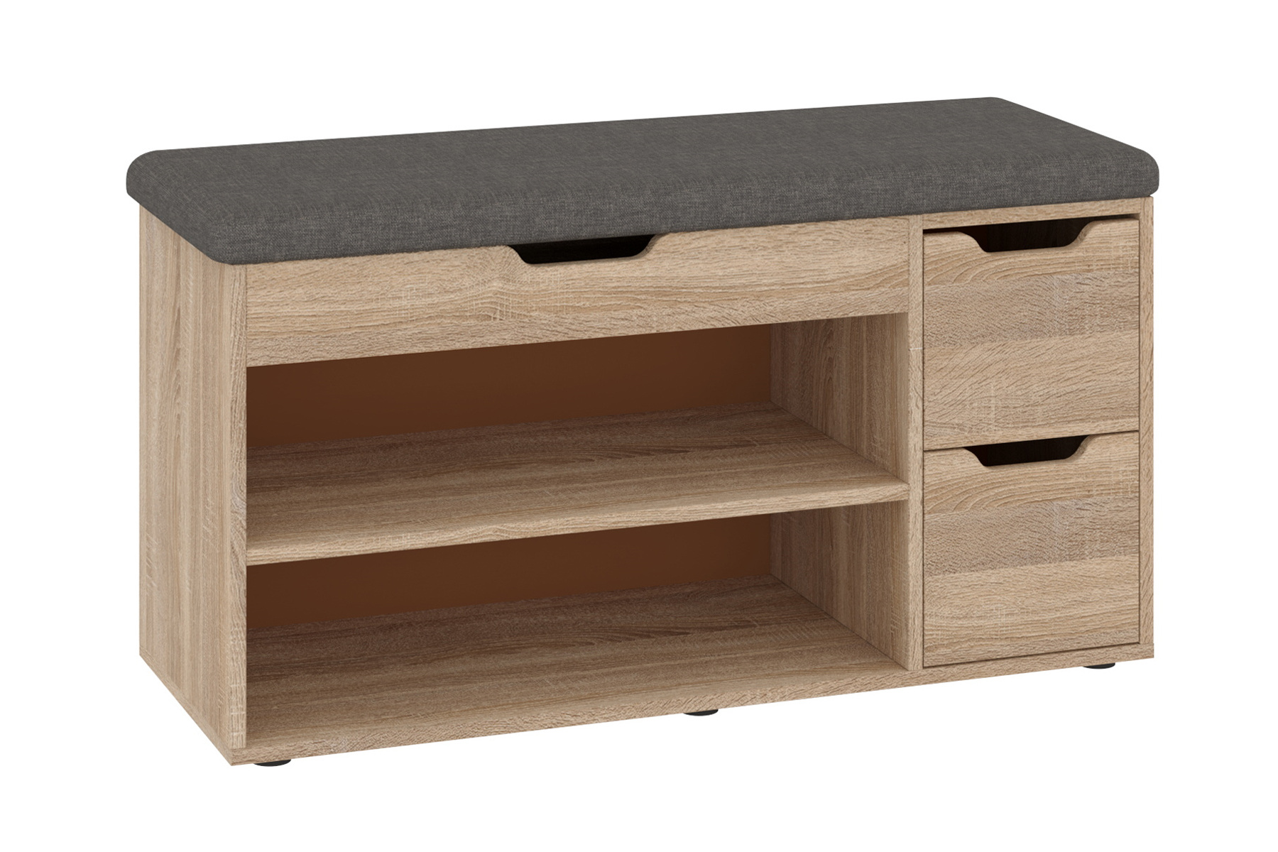 Модель складається з двох основних секцій. Ліворуч розташовані дві відкриті полиці, які також можуть бути використані, як додаткове місце для взуття або інших предметів. Праворуч знаходяться два висувні ящики, які забезпечують простір для зберігання дрібних речей. У ящиків є зручні виїмки замість ручок, що робить їх використання простим і зручним. Ще одна невелика шухлядка під сидінням дозволяє тримати під рукою креми та щітки для взуття.