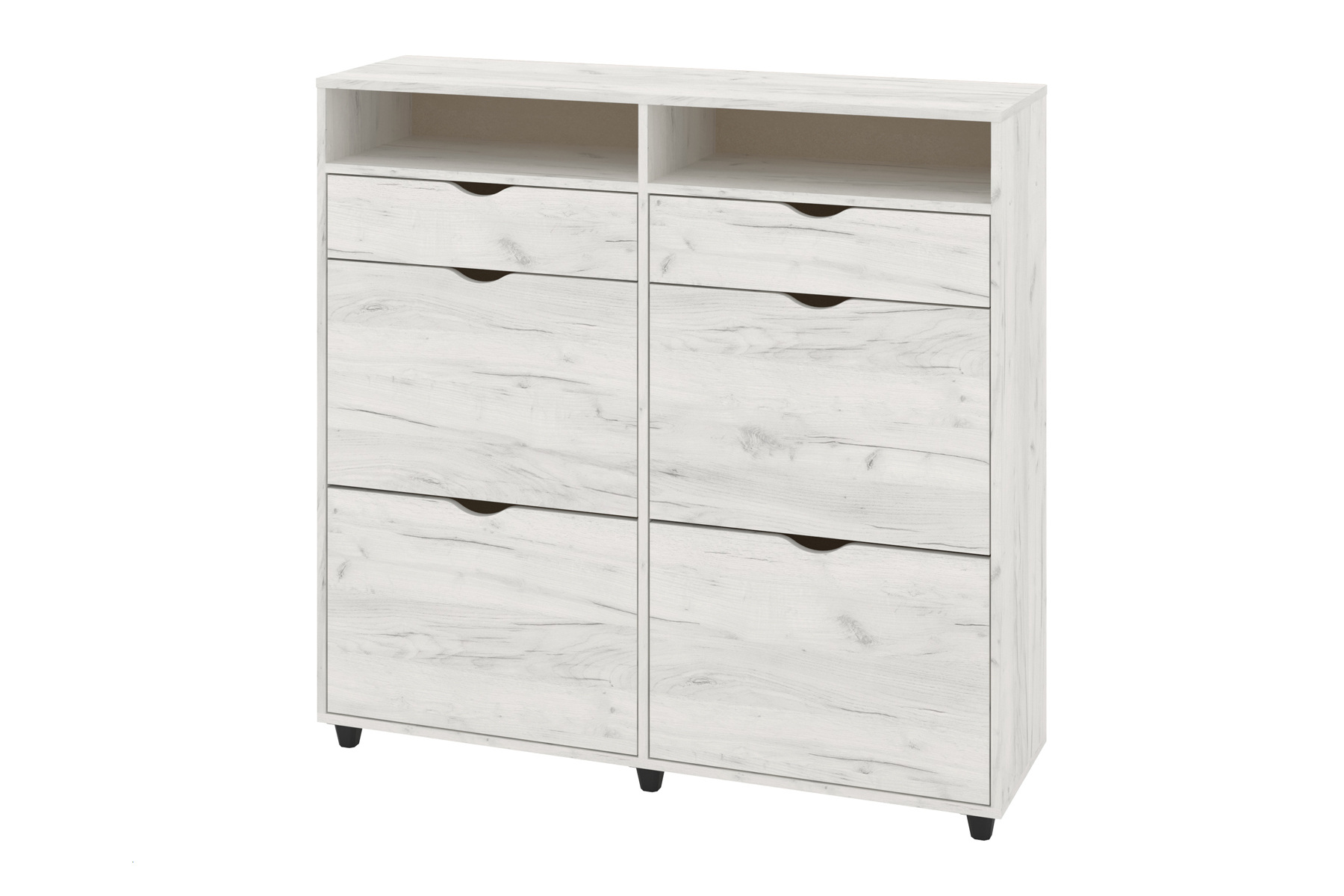 Ця тумба для взуття має сучасний та продуманий дизайн, який відмінно підійде для організації простору у передпокої або вітальні. Дана модель складається з шести окремих відділень, розташованих у два вертикальні ряди, кожне з яких оснащене дверцятами з вирізами для легкого відкривання. Такий дизайн дозволяє зберігати взуття в закритих секціях, що допомагає підтримувати порядок та охайність.