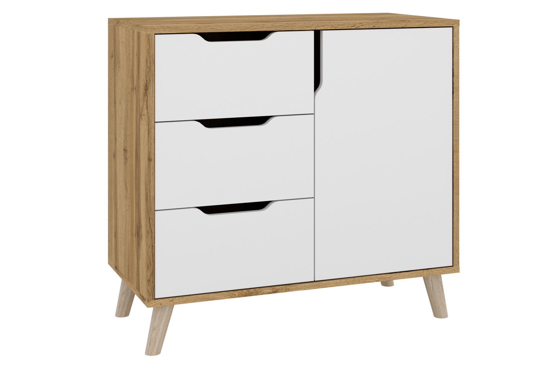 Цей комод оптимально поєднує практичність і елегантність скандинавського дизайну – він має нейтральні світлі кольори та не відволікає на себе зайву увагу від інших елементів інтер'єру. Його можна спокійно використовувати у малогабаритних кімнатах завдяки невеликим розмірам.