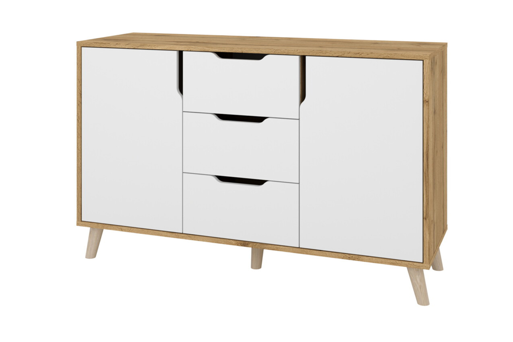 Три ящики та два відділення з дверцятами дозволяють організувати зберігання найрізноманітніших речей, забезпечуючи зручність і порядок у вашій вітальні чи спальні. Конструкція комоду достатньо стійка та чітко спланована, тому користуватися ним дуже зручно.