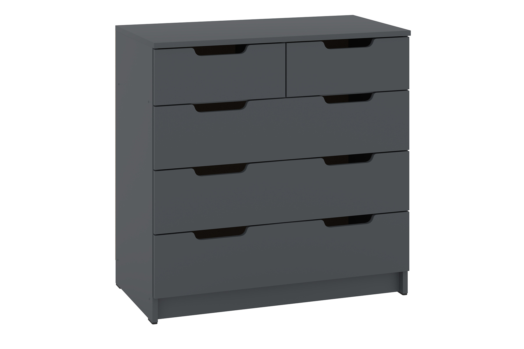 Комод складається з п'яти шухлядок різного розміру, що дозволяє зручно організувати простір для зберігання речей. Два верхні маленькі ящики ідеально підходять для зберігання натільної білизни, побутових дрібниць або аксесуарів. Нижні три великі ящики пропонують місце для більш габаритних предметів, таких як одяг, текстиль чи інші необхідні речі.