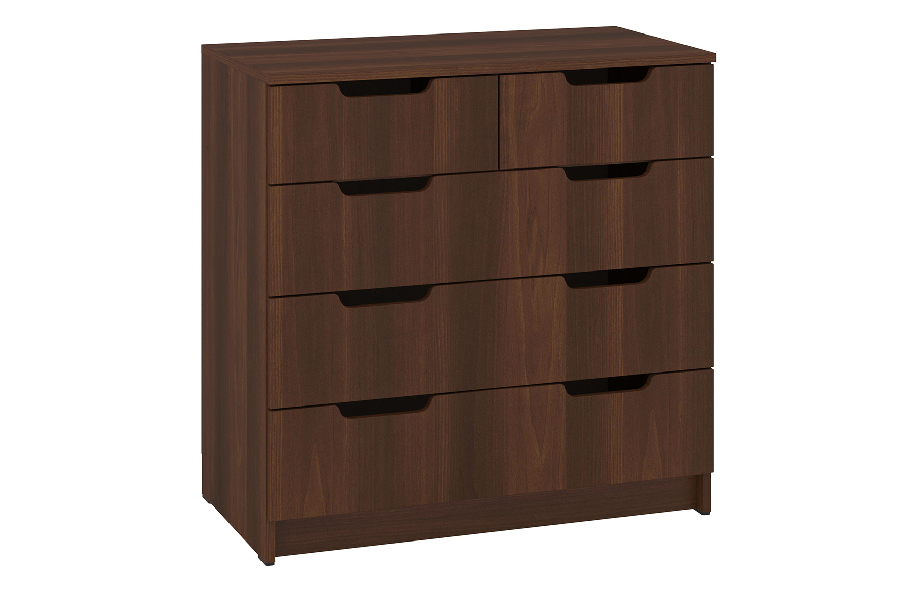 Комод складається з п'яти шухлядок різного розміру, що дозволяє зручно організувати простір для зберігання речей. Два верхні маленькі ящики ідеально підходять для зберігання натільної білизни, побутових дрібниць або аксесуарів. Нижні три великі ящики пропонують місце для більш габаритних предметів, таких як одяг, текстиль чи інші необхідні речі.