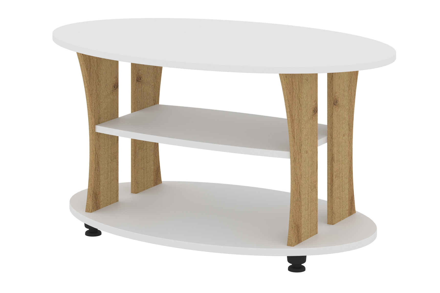 Дана модель представляє собою овальний столик з двома додатковими поличками під стільницею. Стіл має сучасний дизайн однотонного відтінку або з комбінованими кольорами. У другому варіанті: світла стільниця та полички контрастують з темними ніжками.