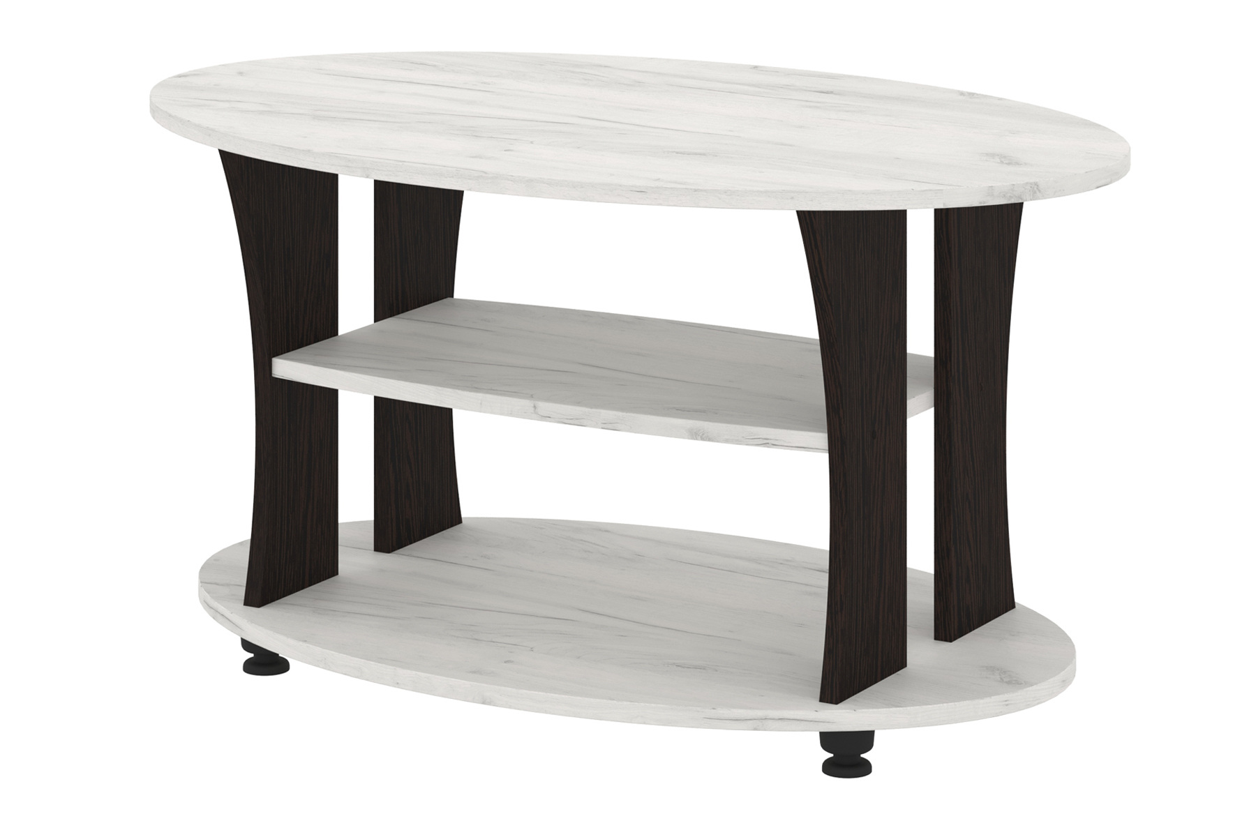 Дана модель представляє собою овальний столик з двома додатковими поличками під стільницею. Стіл має сучасний дизайн однотонного відтінку або з комбінованими кольорами. У другому варіанті: світла стільниця та полички контрастують з темними ніжками.