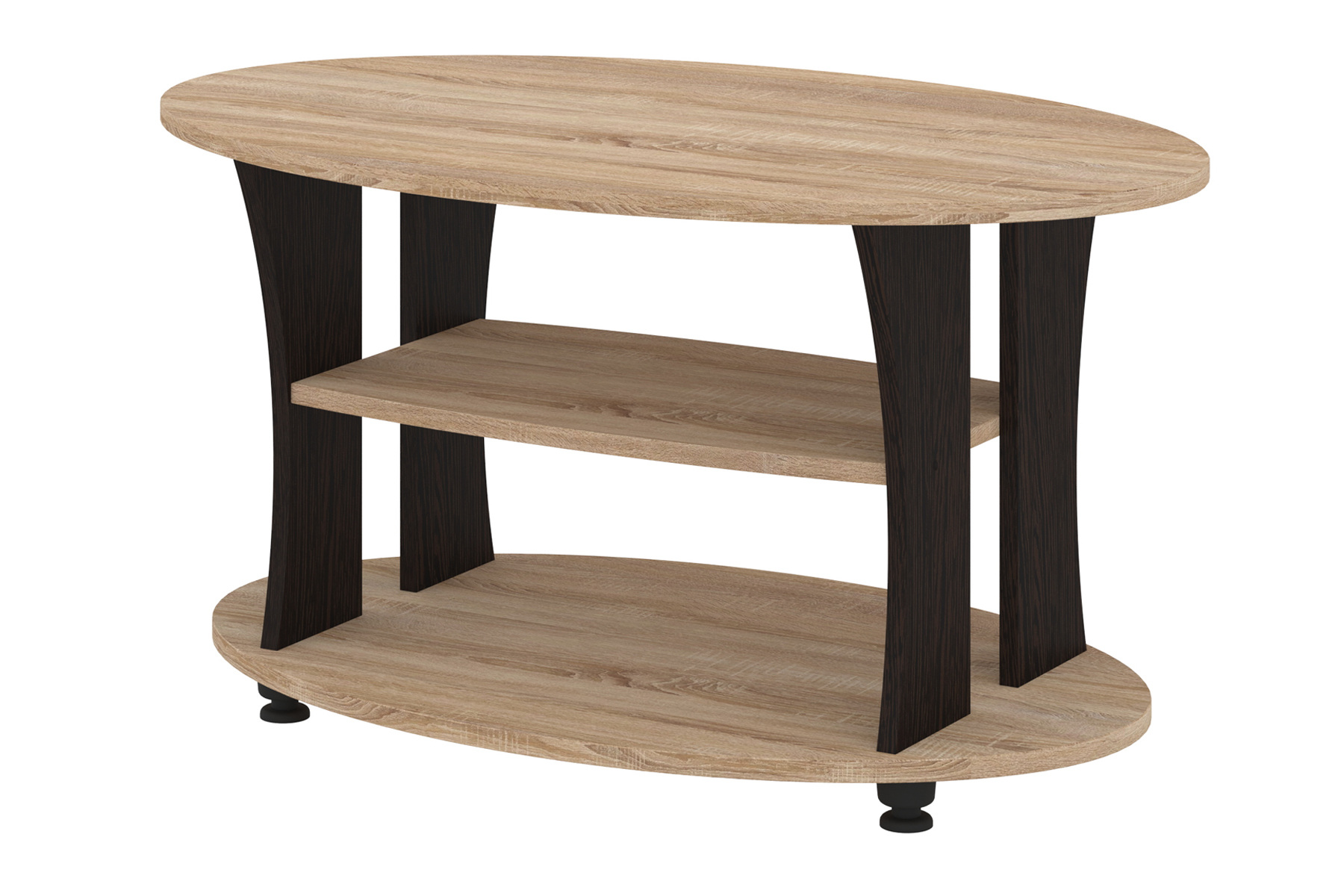 Дана модель представляє собою овальний столик з двома додатковими поличками під стільницею. Стіл має сучасний дизайн однотонного відтінку або з комбінованими кольорами. У другому варіанті: світла стільниця та полички контрастують з темними ніжками.