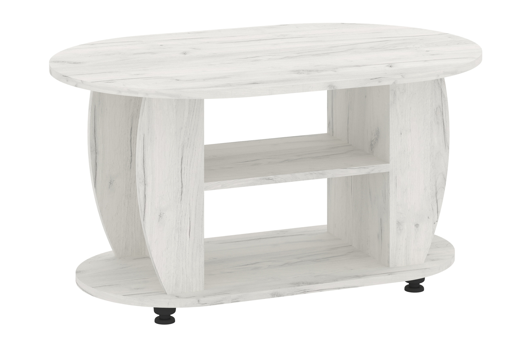 Основу столика становлять дві масивні, плавно вигнуті ніжки, що підтримують конструкцію і додають їй стабільності. Між ніжками розташовані дві додаткові полиці, які можна використовувати для зберігання книг, журналів, пультів чи інших дрібниць. Вони забезпечують порядок і організованість у вашій вітальні.