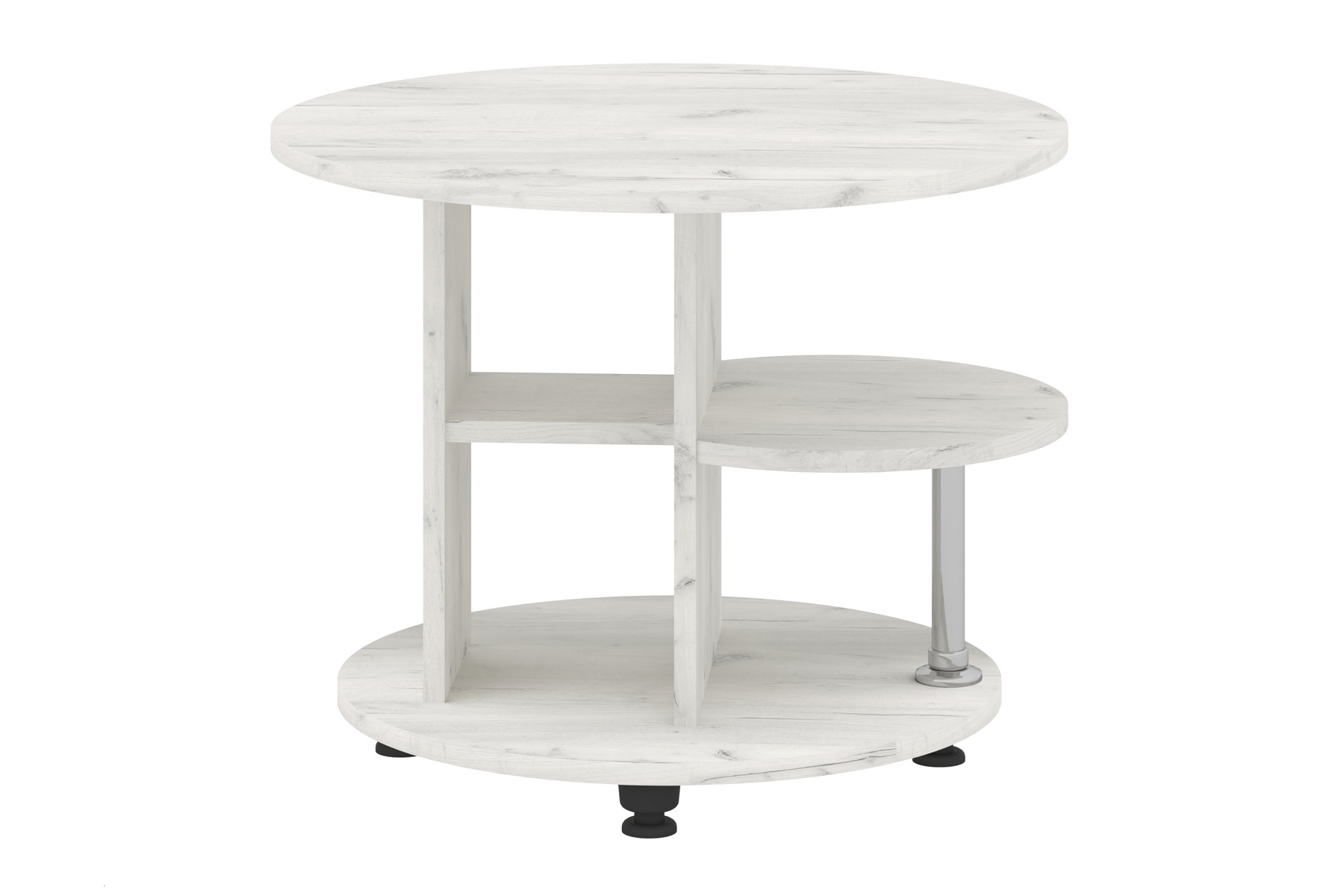 Дана модель кавового столику відрізняється оригінальним та трохи футуристичним дизайном, який гармонійно впишеться у сучасний інтер’єр. Основною особливістю столика є його кругла стільниця, яка плавно переходить у три яруси з полицями різної форми та розмірів. Столик має міцну конструкцію, що складається з центральної вертикальної опори і додаткової металевої ніжки, яка робить його достатньо стійким.
