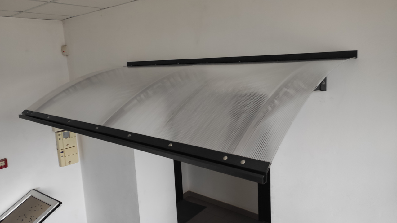 Виготовлений з високоякісного полікарбонату, цей навіс є міцним та стійким до ультрафіолетових променів, що забезпечує тривалий термін служби без вигорання або пошкоджень. Полікарбонат також має високу прозорість, дозволяючи достатньо природного світла проникати до входу.