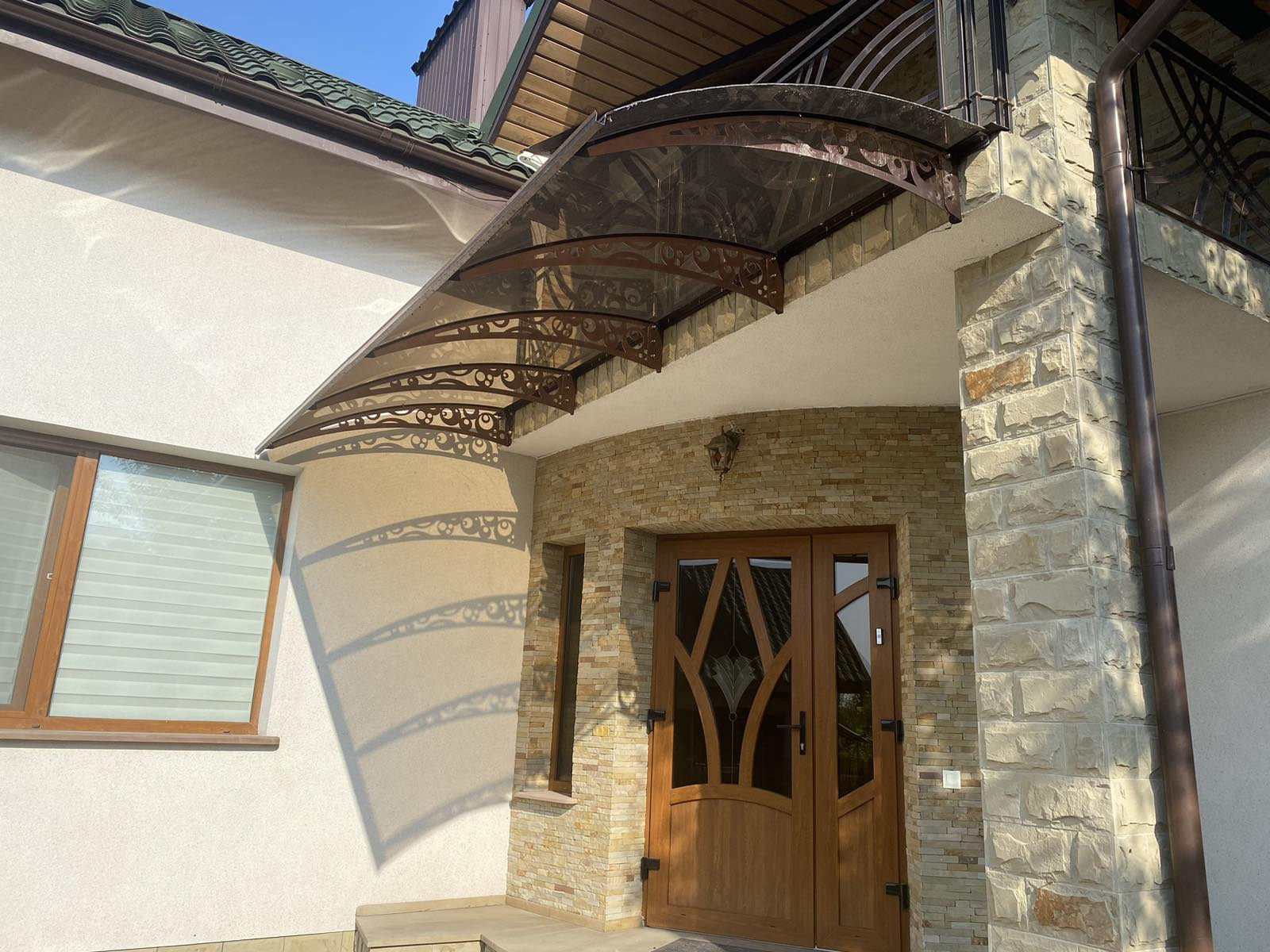 Виготовлений з високоякісного полікарбонату, цей навіс є міцним та стійким до ультрафіолетових променів, що забезпечує тривалий термін служби без вигорання або пошкоджень. Полікарбонат також має високу прозорість, дозволяючи достатньо природного світла проникати до входу.
