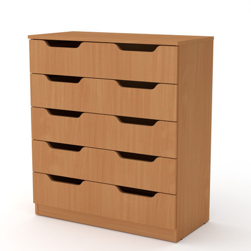 Комод включает в себя 5 выдвижных ящиков на роликовых направляющих. Комод изготовлен из ДСП фирмы Swisspan (Швейцария). Этот качественный и экономичный материал отлично подходит для мебели в доме.