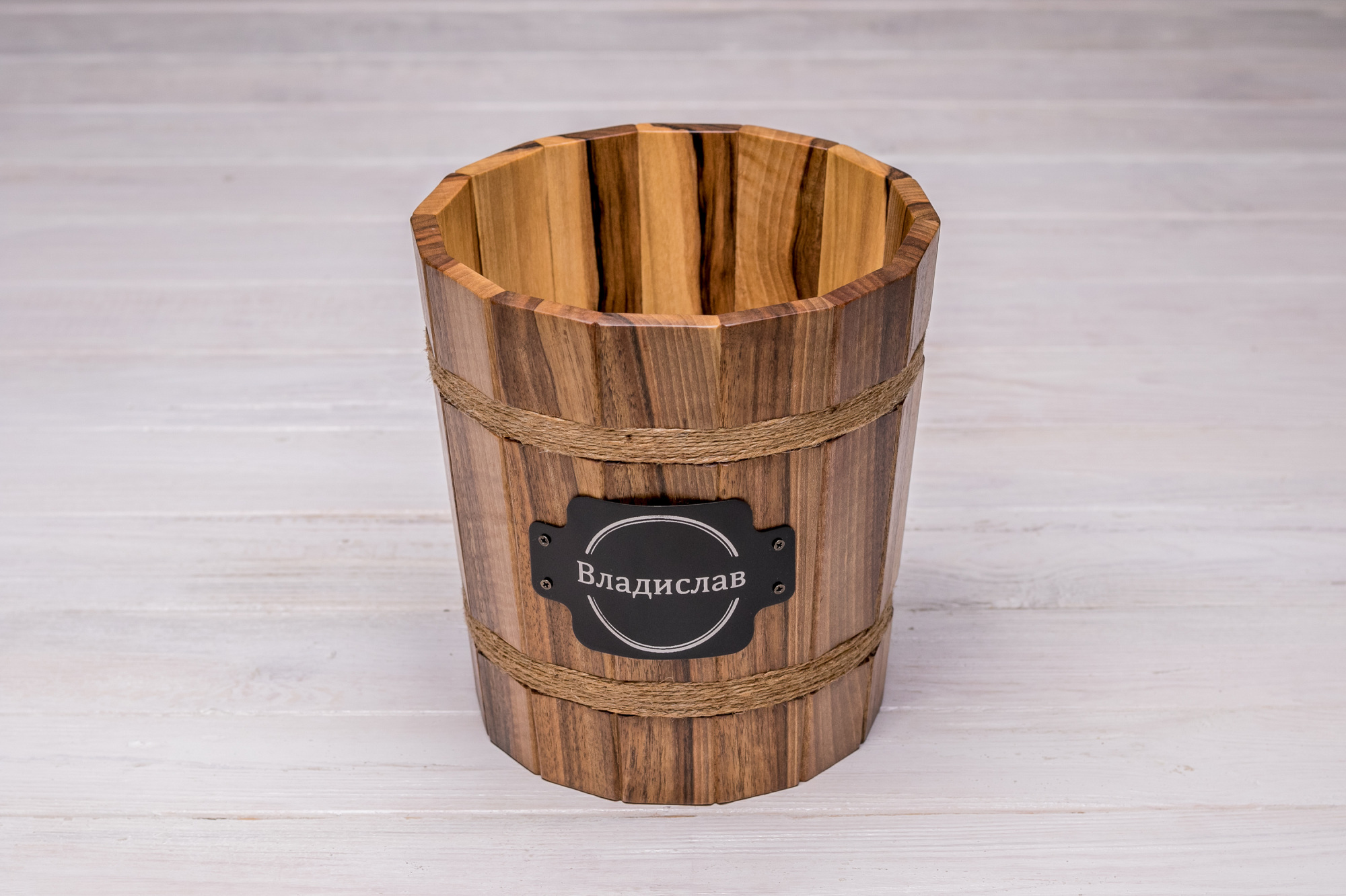 Деревянное ведерко с металлической бляхой будет отличным дополнением Вашего интерьера, это изделие легко добавит тепла и комфорта Вашему дому. Ведерко из древесины ореха многофункционально: оно станет как помощником на кухне - храните в нем овощи, фрукты, орехи и так далее, так и элементом декора; даже мелкие детские игрушки могут найти свое место именно здесь. Тут уж как Вам подскажет фантазия. Изделие может контактировать с водой, оно достаточно крепкое и, как следствие, долговечное.