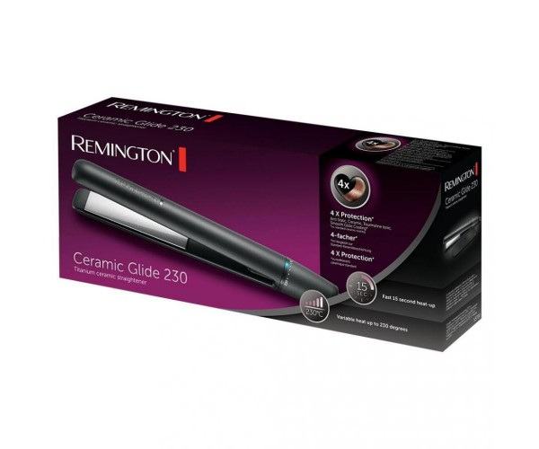 Утюжок для волос Remington CERAMIC GLIDE S3700 выполнен в чёрном цвете с плавающими пластинами шириной 110 мм. Особенностью модели можно назвать специальное покрытие пластин из комбинации титана и керамики, покрытых турмалиновым напылением. Применение таких материалов обеспечивает плавное скольжение волос и уменьшение статического электричества. В результате волосы не только защищаются от зацеплений и ломкости, но ещё им придаётся дополнительный блеск. Прибор работает в восьми температурных режимах в диапазоне от 150С до 230С. Время нагрева до максимальной температуры не превышает 15 секунд, при этом включённое состояние устройства отображается светящимся индикатором. Для удобства использования и хранения имеются поворотный на 360 градусов шарнир сетевого шнура и термостойкий чехол.