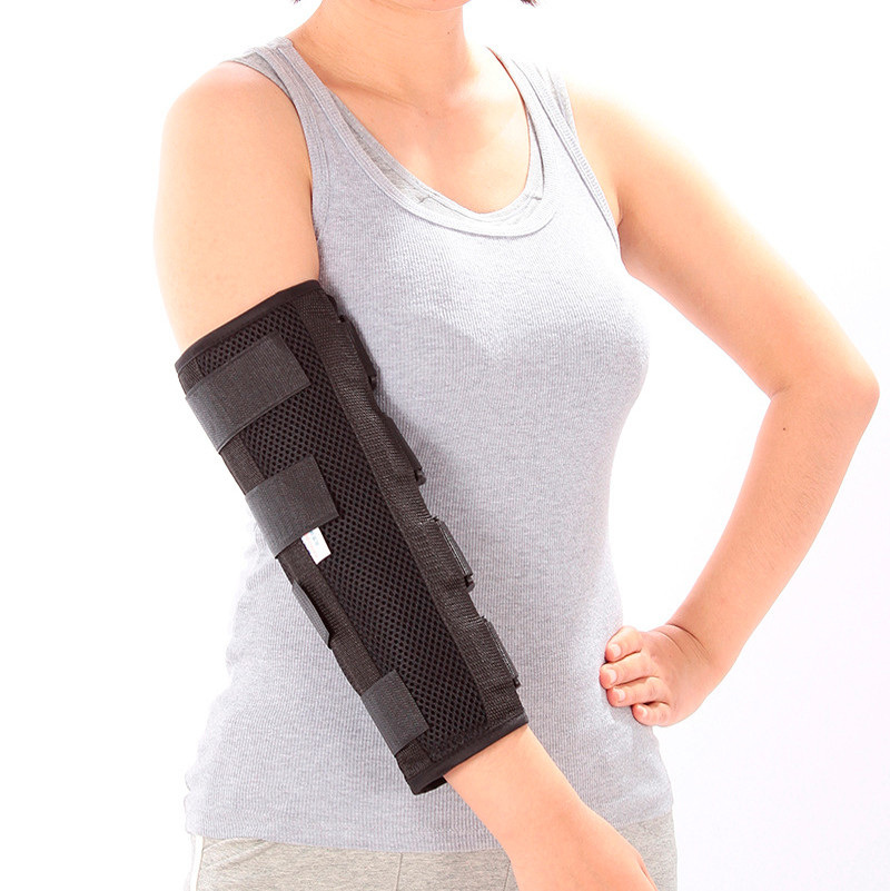 Фиксатор локтя Lesko 7082 — бережный и эффективный способ иммобилизации руки Тутор на локоть Lesko 7082 — качественное фиксирующее ортопедическое приспособление с ребрами жесткости для создания условий неподвижности сустава и облегчения боли. Применяется для: посттравматического восстановления зоны локтевого сустава; разгрузки и компрессии мышц; реабилитации после инсульта; помощи при гемиплегии, артрите, тендините, теннисном локте, туннельном синдроме, ущемлении локтевого нерва; стабилизации при других заболеваниях, повреждениях и травмах. Особенности и характеристики фиксатора локтя Lesko 7082 Иммобилайзер локтя производителя Lesko имеет следующие характеристики и преимущества: длина шины 305 мм, ширина верхней части 180 мм; универсален — подходит как для правой, так и для левой руки мужчинам и женщинам, размер S; оснащен четырьмя велкро ремнями для легкой регулировки — стяжные фиксирующие ремни на липучке позволяют надежно закрепить аппарат; материал нейлон — прочный, легкий, износоустойчивый, не выгорает и не линяет, легко чистится; сетчатые вставки обеспечивают циркуляцию воздуха и позволяют коже дышать; жесткая степень фиксации — металлические ребра жесткости эффективно сжимаются, обеспечивают надежную поддержку и предотвращающих сгибание руки. Аккуратно зафиксируйте ортез, чтобы ограничить диапазон движения руки. Можно поместить кусок фланели или другой мягкой натуральной ткани между кожей и шиной для улучшения комфорта. Локтевая шина Lesko 7082 бережно иммобилизирует локоть, помогая предотвратить болезненные и вредные движения и улучшить сон ночью.
