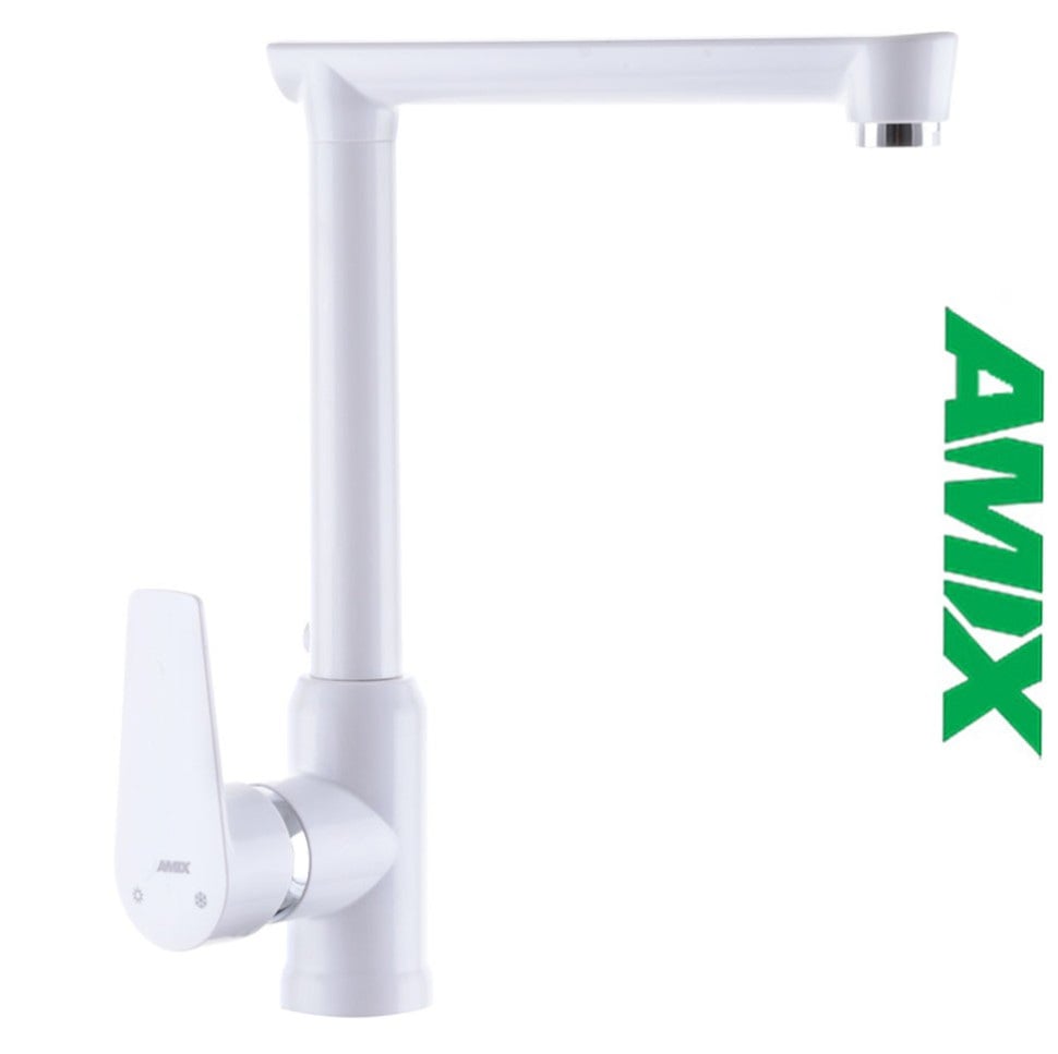AMIX Mario-017 White - Компанія amix розробляє та виробляє широкий спектр недорогих та якісних кранів та змішувачів. Вартість моделі невисока, якщо порівнювати з аналогами. При цьому кран для умивальника прослужить довго. Змішувач умивальника комплектується аератором, що дозволяє заощаджувати воду. Модель виконана з термопластику, зручний важіль керування. Змішувач для раковини білий ремонтопридатний одноважільний - дрібні поломки можна усунути своїми руками. Кран має зовнішній тип монтажу, приєднується за допомогою гайки та гнучкої підводки, яка не йде разом із змішувачем.