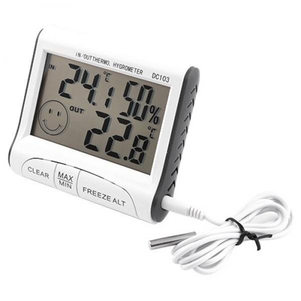 Часы настольные с гигрометром, термометром DC-103 с выносным датчиком (метеостанция) Термометр электронный с гигрометром, часами и выносным датчиком DC-103 DC-103 - это многофункциональный прибор. В него входят: гигрометр, термометр со встроенными часами. Устройство как DC-103 просто необходимо в каждом доме, ведь оно универсально и кроме значений температур и влажности показывает время и дату. Прибор выполнен в качественном корпусе из ABS пластика с удобной ножкой-подставкой и магнитом для крепления на металлических предметах. Для простого считывания показаний устройство имеет ЖК-дисплей размером 62х37 мм с большими цифрами. На лицевой стороне расположены три кнопки управления. Также он поддерживает два типа единиц измерения °C и °F, имеет функцию памяти максимального и минимального значения температуры. Кроме температуры и влажности в помещении, прибором можно измерять температуру воздуха на улице с помощью идущего в комплекте выносного датчика температуры длинной 1 метр. Работает DC-103 от одной батарейки AG13 (таблетка). Особенности: Наличие памяти минимальной и максимальной температуры; Измерение температуры и влажности воздуха в помещении + температура на улице; Магнит для крепления на металлических поверхностях; Анимационный смайлик; Современный дизайн; Выбор единиц измерения температуры °C/°F. Технические характеристики: Измерения температуры в помещении: от -10°C до + 50°C (±1°C); Измерения температуры на улице: от -50°C до + 90°C (±1°C); Диапазон измерения влажности: 10% ~ 99% (±1%); Длина кабеля датчика наружной температуры: 1 м; Дисплей: LCD 2,9"; Питание: 1 батарейка AG13 таблетка; Размеры: 80 мм х 70 мм х 20 мм. Вес прибора: 61 гр. Комплект поставки: Термометр - гигрометр DC-103; Наружный датчик; Батарейка AG13 (маленькая таблетка); Инструкция на английском; Блистерная упаковка.