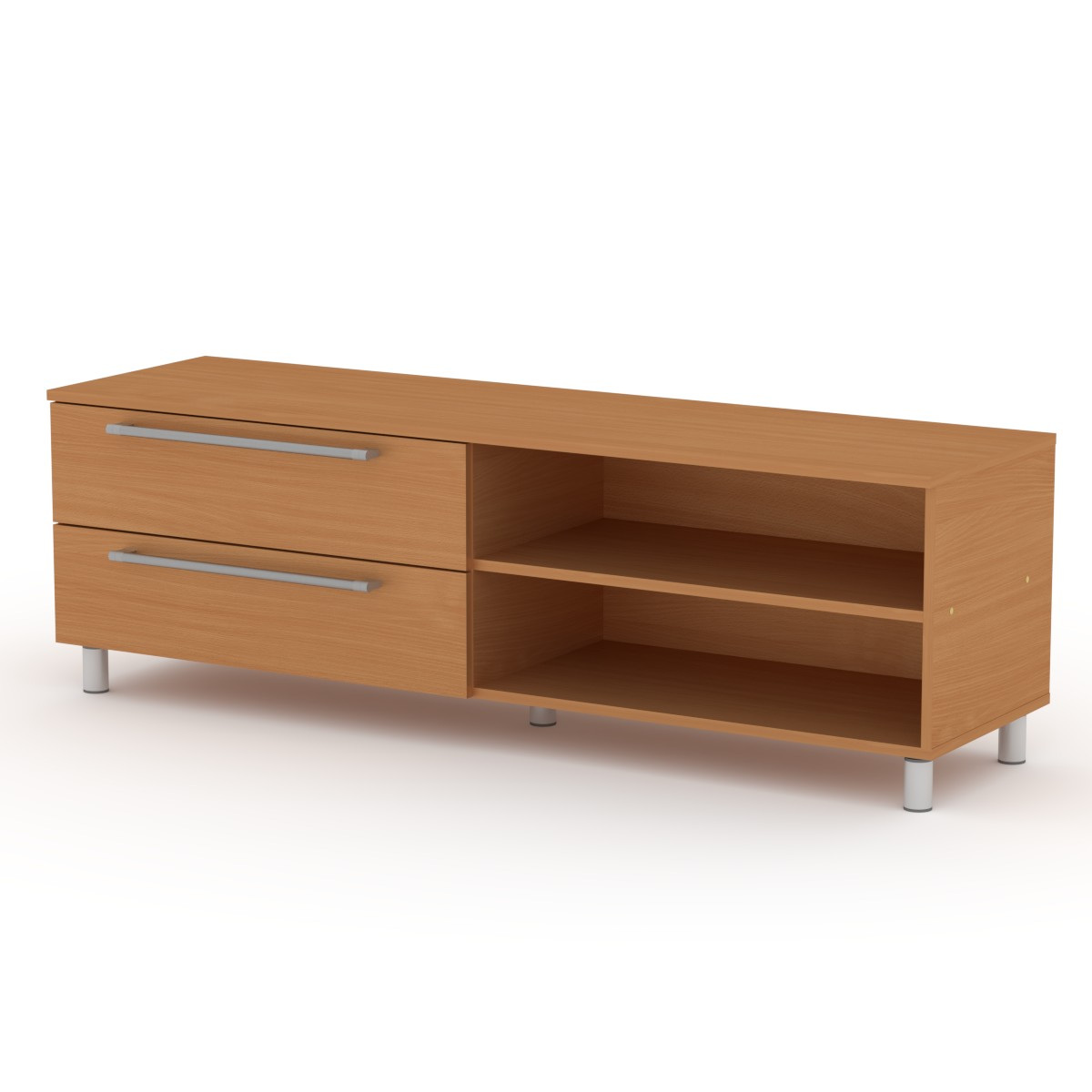 Тумба під ТВ-1 МГ-4 виготовлена з ламінованого ДСП завтовшки 16 мм. Компактна тумба, що складається з двох висувних ящиків та двох відкритих ніш, розташованих одна під одною. Завдяки достатній кількості відділень, подібна конструкція розмістить супутню техніку та дрібні необхідні речі. Така тумба гармонійно виглядатиме в просторі кімнати.
