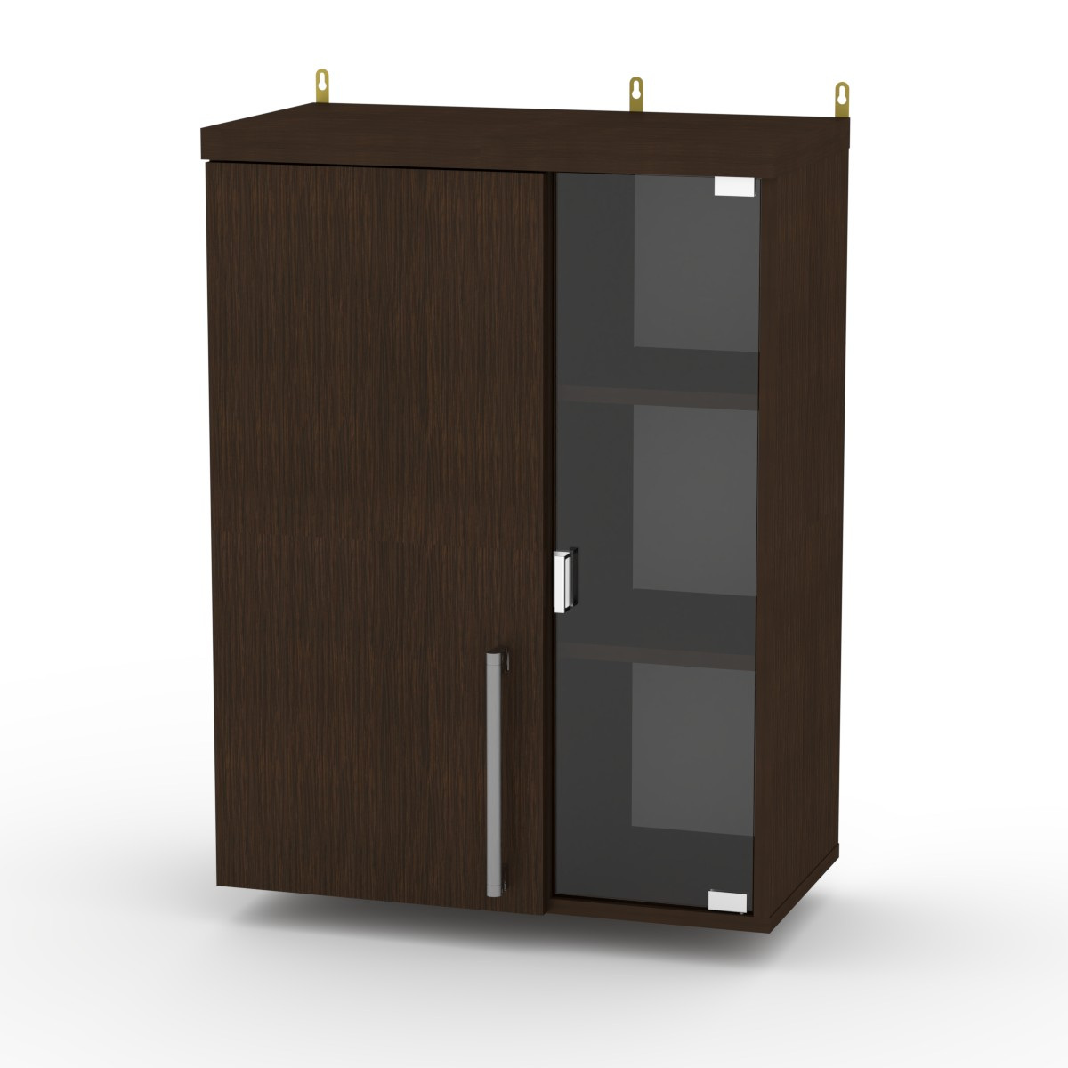 Тумба Навісна-1 МГ-2 виконана з ламінованого ДСП, товщиною 16 мм. Така тумба містить одне закрите відділення з полицею та дві полиці за скляними дверцятами, на яких можна зберігати різноманітні необхідні речі та предмети декору. Досить містка модель, яка не займе багато місця в кімнаті, і стане зручним предметом інтер'єру.