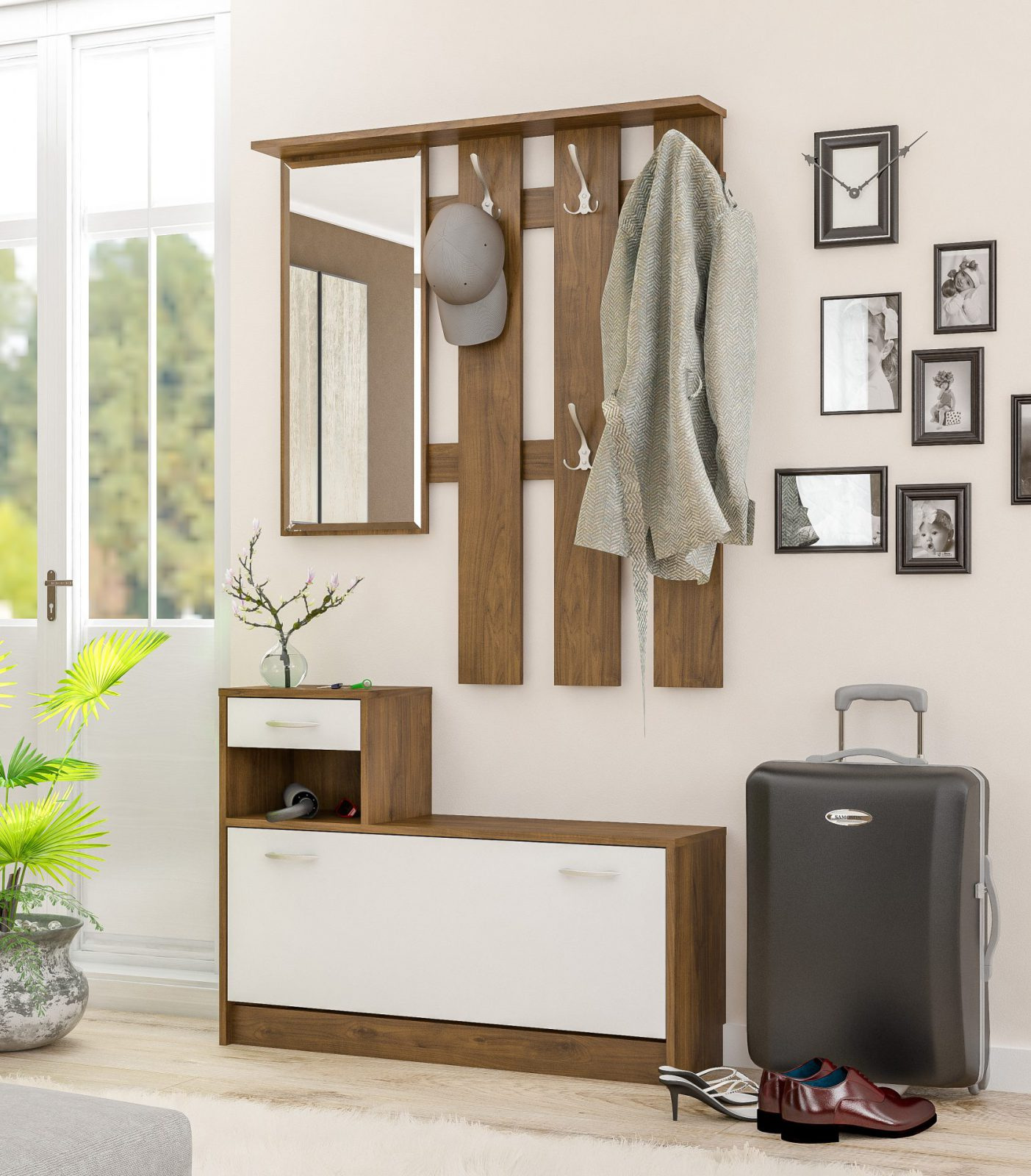 Передпокій Оріон Виготовлена з ДСП товщиною 16 мм. Дана модель складається з відкритої вішалки з трьома гачками; тумби з відкидними дверцятами, відкритою нішою та висувною скринькою; дзеркала. Можливо додатково обладнати м'яким сидінням для комфортного процесу взування. Така конструкція міцна, містить у своєму складі найнеобхідніші елементи, при цьому приваблива та оригінальна зовні, що дозволить стати прикрасою інтер'єру.