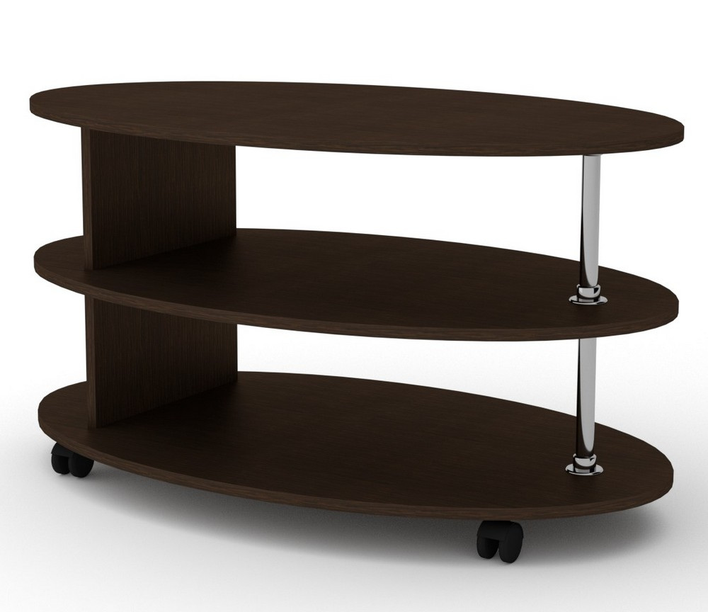 Стіл журнальний виготовлений з ламінованого ДСП, завтовшки 16 мм, кромка ПВХ 0,5 мм. Сучасна комбінація кольорів дозволить створити будь-який інтер'єр Вашої кімнати. Овальний столик на коліщатках може стати універсальним та незамінним предметом у вашій вітальні, а додаткові полиці забезпечують достатньо місця для декоративних предметів, паперів, газет та журналів.