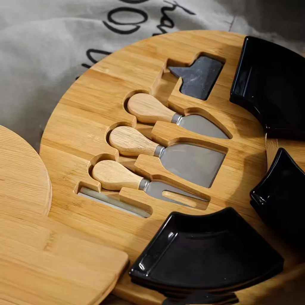 Круглая разделочная доска из бамбука станет идеальным дополнением к вашей кухне или праздничному столу. Доска диаметром 33см обеспечивает достаточно места для нарезки и сервировки. В комплект входят три керамических соусника для подачи соусов или дипов, три ножа для сыра разной формы, а также лейбл и мелки для маркировки продуктов или сыров.