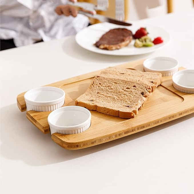 - Комплектация: бамбуковая доска, 4 керамических соусника