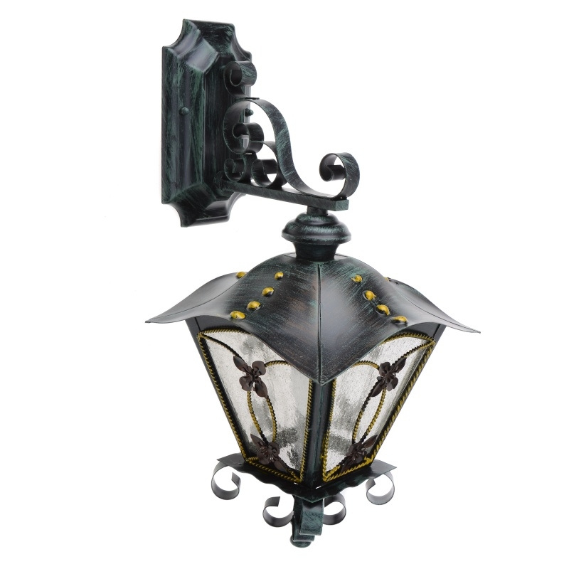 Светильник уличный настенный фасадный накладной GL-49 AM, выполненный из материала Металл в цвете Зеленый. Дизайн оформления — в актуальном стиле Классический. В качестве источника света используется лампочка с цоколем E27.