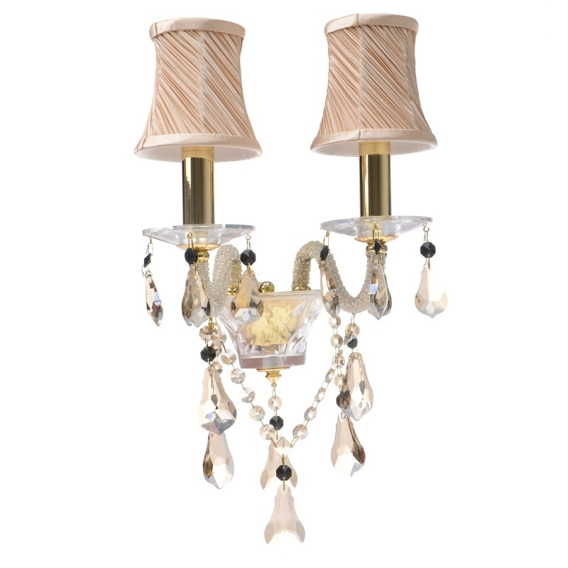 Бра настенное накладное в спальню хрустальное с абажуром классическое BCL-314W/2, выполненное из материала Металл в цвете Золотистый. Дизайн оформления — в актуальном стиле Классический. В качестве источника света используется лампочка с цоколем E14 и мощностью 60W.