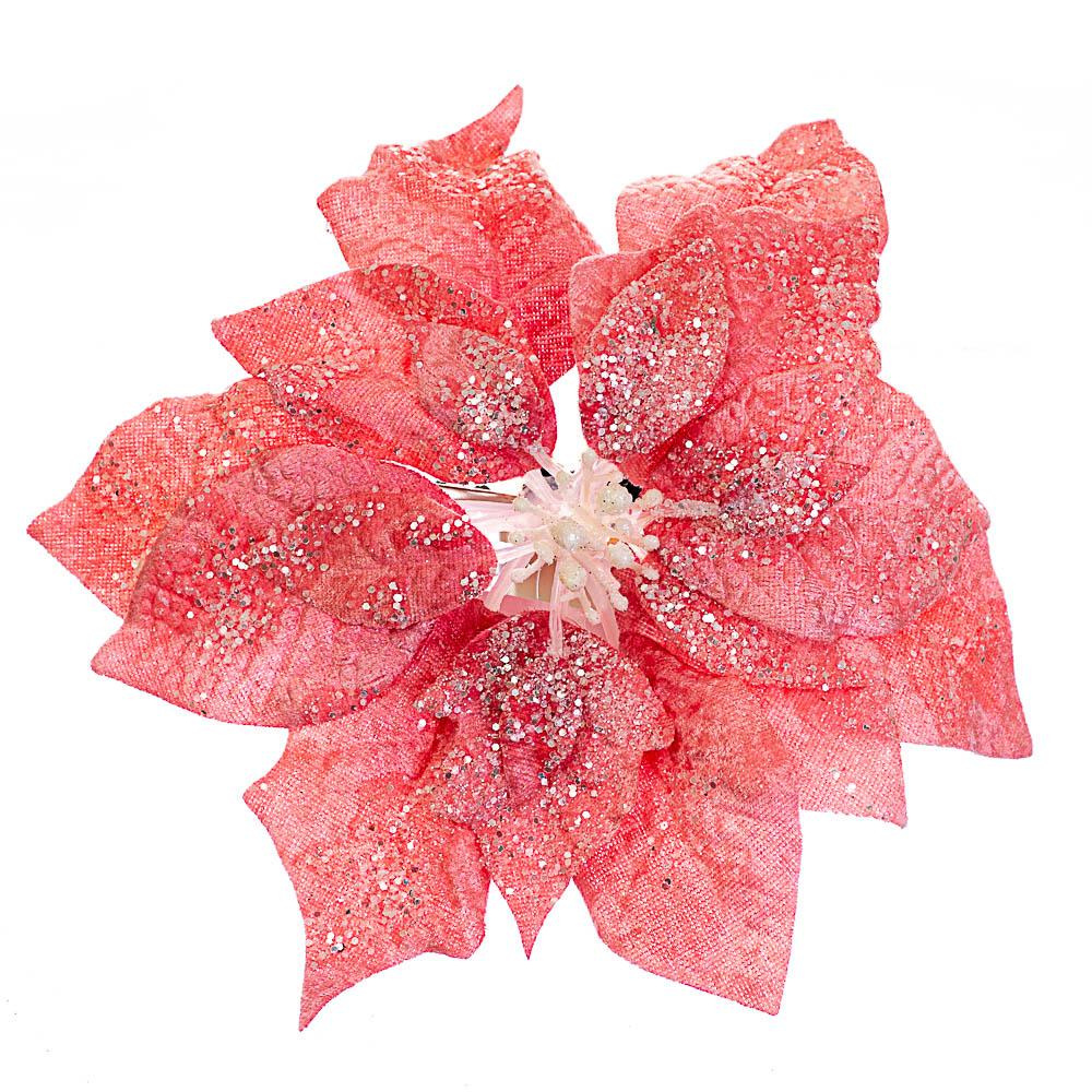 Размер цветка - 20 см Сзади крепится на прищепку. Декоративный искусственный цветок превратит обычный букет в оригинальную композицию и тут же напомнит о праздниках. Дайте волю фантазии и создавайте свои собственные дизайнерские шедевры. Эти цветы мгновенно придадут прздничному интерьеру стильную ноту и сделает его уникальным. На цветке есть блестки, что делают цветок еще более выразительным.