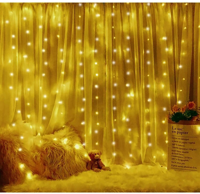 - 8 режимов занавесочного света - 300 * 300 см (ширина * длина), 300 теплых белых светодиодных огней. Великолепные режимы освещения, включают: комбинацию, волновую вспышку, переменную вспышку, дыхание, погоню, медленную вспышку, вспышку и постоянный свет; Всего одна кнопка, для переключения и выбора понравившегося режима.
