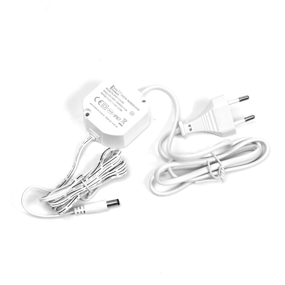 Блок живлення імпульсний. Вихід: 12 В / 1 А, роз'єм живлення. Вхід: AC 100-240 В, мережевий шнур з вилкою в розетку. Матеріал: пластик. Клас захисту: IP 67. Робоча температура: від -20 до +50°C. Розмір: 47.5 х 47.5 х 25 мм. Вага: 99 г.,Мініатюрний вологозахищений блок живлення BGP-121UW Full Energy імпульсний, одноканальний, для роботи від мережі 220 В та перетворення напруги на виході в 12 В / 1 А. Вологозахищений IP67, встановлюється в підрозетник.