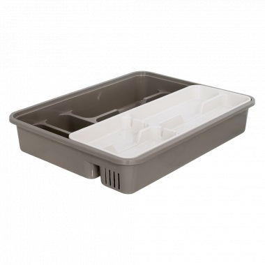 Лоток для столових приладів зі вставкою відрізняється удосконаленою конструкцією. Виріб комплектується додатковим лотком для столових приладів, формуючи 2-поверхову конструкцію. Сіро-біла кольорова гама виробу доступна у 4 варіантах. Лоток відрізняється високою якістю, доступною вартістю та відмінними експлуатаційними властивостями.