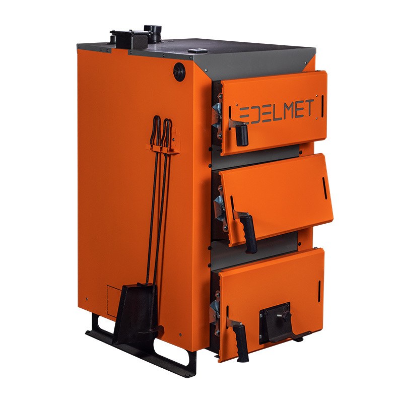 Твердопаливний котел Edelmet потужністю 27 кВт призначений для обігріву 270 м². Товщина металу камери згорання становить 6 мм. Теплообмінник котла виготовлений з високоякісної сертифікованої сталі 09Г2С. Високий ККД - 85%, завдяки покращеному відбору тепла димових газів. Можна регулювати сторони відкриття дверцят. Велика камера згорання, яка дозволяє зручно закидати довгі поліна. Твердопаливний котел Еделмет має 3 варіанти підключення вентилятора до котла. Також є можливість підключення пелетного пальника. Тривалість згорання разового завантаження палива до 8 годин.