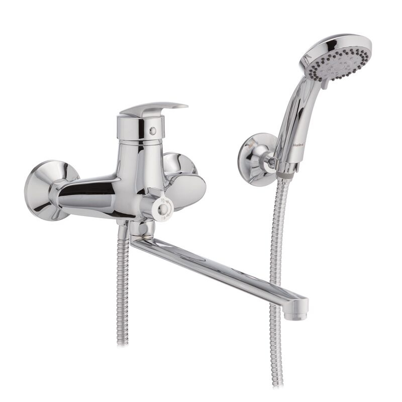 Змішувач для ванної з поворотним виливом Haiba Agat 006 EURO має замінний запірний елемент - картридж з керамічними пластинами діаметром 40 мм. Встановлюється на труби холодної та гарячої води, вмонтовані у стіну. Закріплюється за допомогою ексцентриків, які йдуть у комплекті разом із гумовими прокладками, декоративними чашками, шлангом, лійкою та кронштейном.