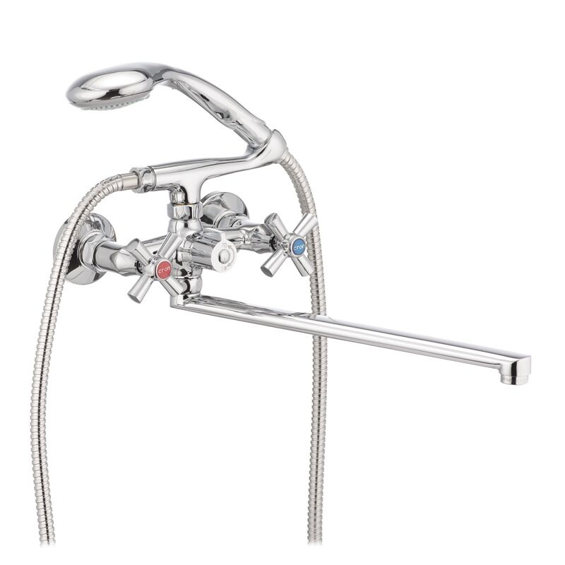 Змішувач для ванної з поворотним виливом Cron Polo 140 Euro має замінний запірний елемент - напівоборотну керамічну кран буксу розміром 1/2. Встановлюється на труби холодної та гарячої води, вмонтовані у стіну. В комплектацію входить шланг 150 см, режимна лійка, чашки, ексцентрики, гумові прокладки, тримач для лійки "Ріжок".
