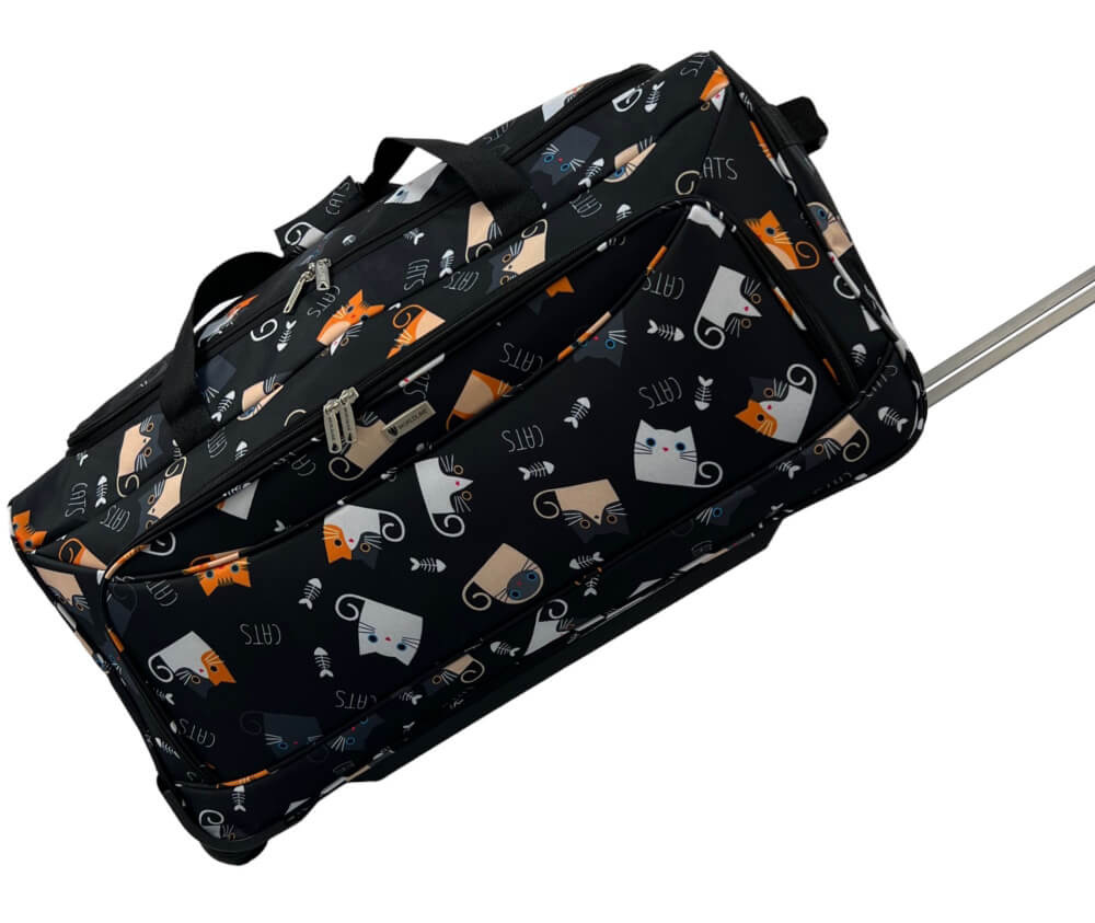Эта модель с уникальным принтом изготовлена из полиэстера – прочного износостойкого материала. Сумка оснащена двумя бесшумными колесами, которые утоплены в корпус, и выдвижной ручкой. Кроме основного отдела, сбоку имеется длинный карман. Сумку удобно как везти на колесах, так и нести в руке – для этого есть еще две ручки.
