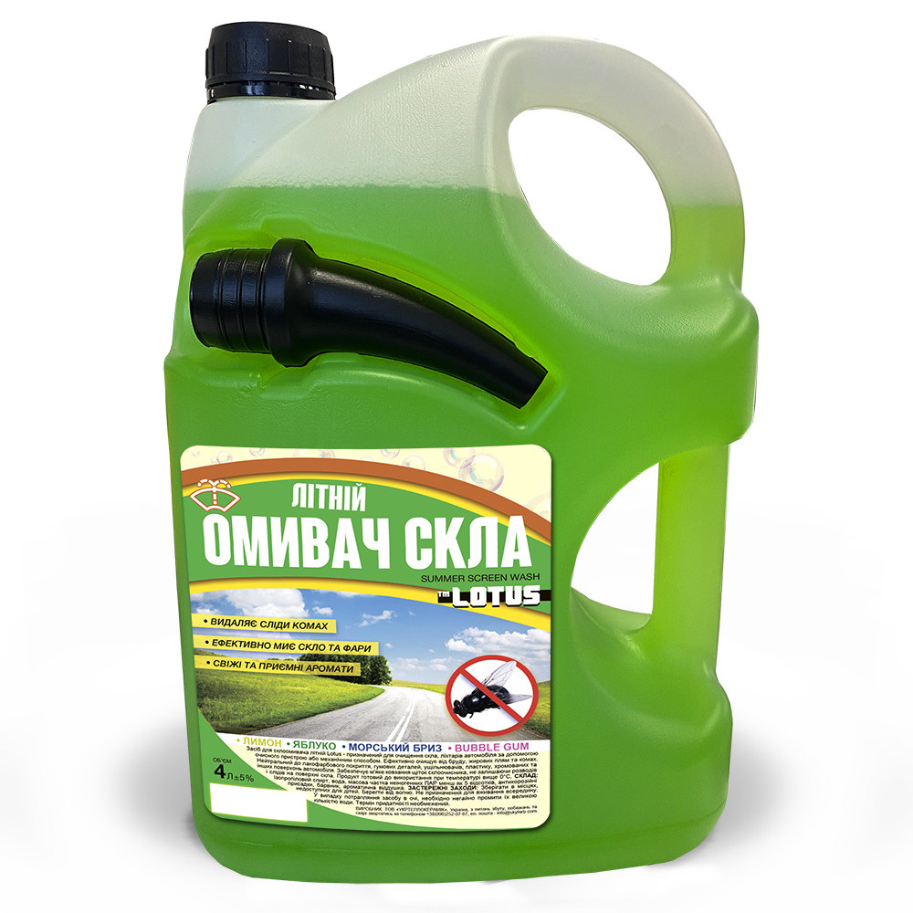 Рідина омивача скла і фар з ретельним ефектом очищення, призначена для використання в теплу пору року. Зручна тара з насадкою-носиком дозволяє швидко та легко заповнити ємність мінімізуючи втрати. Літній омивач Лотус забезпечує швидке та якісне видалення забруднень, включаючи сліди від мошок, клей дерев, бітум, наліт від дорожніх реагентів та багато іншого. Залишки засобу самостійно випаровуються зі скла, не залишаючи патьоків, смуг або райдужних розводів, для максимальної прозорості лобового скла та комфортного огляду у будь-який час доби. Має у складі спеціальні віддушки, які надають рідині приємного аромату "Яблуко". Не містить у складі метилового спирту і є безпечним для здоров'я людини та навколишнього середовища. Рідина повністю готова для використання і не потребує попереднього розведення водою.