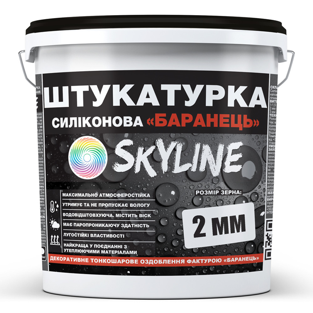 Силіконова декоративна штукатурка «Баранець» Skyline – багатофункціональний матеріал з довготривалим терміном експлуатації, що представляє собою декоративне атмосферо- та водостійке міцне покриття, приховує значні недоліки та дефекти поверхні. Чудово прикрашає будинок, створює гарну структуру. Знаходить своє широке застосування на фасадах будівель та споруд, коридорах, верандах, літніх кухнях, балконах, лоджіях, передпокоях та інших приміщеннях. Легко наноситься без застосування спеціальних інструментів. Стійка до миття та мокрого стирання. Можна мити із застосуванням миючих засобів. Перед нанесенням штукатурки обов’язково використовувати фарбу-грунт з кварцевим піском.