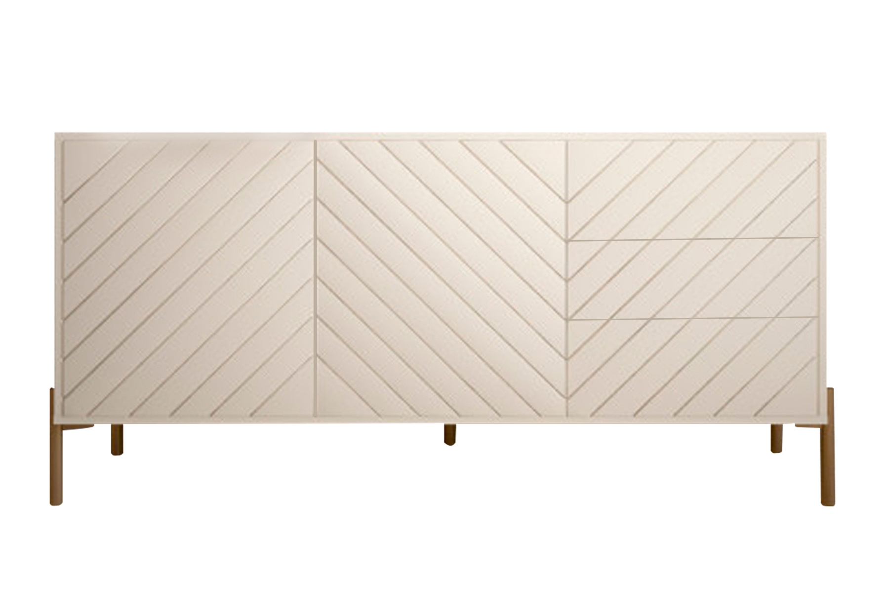 Комод GlacierGrove має сучасний дизайн з лаконічними геометричними лініями. Фасад прикрашено стильним візерунком «ялинка», що додає текстури та акцентує його сучасний стиль. Високі металеві ніжки дозволяють зручно використовувати робот пилосос для прибирання.